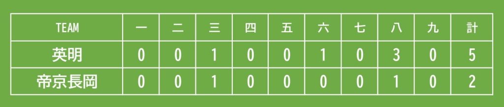 ・先攻:英明(四国・香川) ①遊 池田 ②左 太田 ③右 松本一 ④捕 髙田 ⑤一 松原 ⑥三 榎本 ⑦中 矢野 ⑧二 中條 ⑨投 冨岡