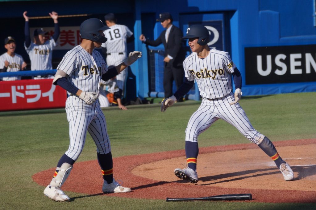 3回裏、帝京長岡は1死3塁から捕手のけん制悪送球の間に3塁走者の富田惇紀(写真右・2年)が生還し、神宮大会初得点。1ー1の同点に追いつく