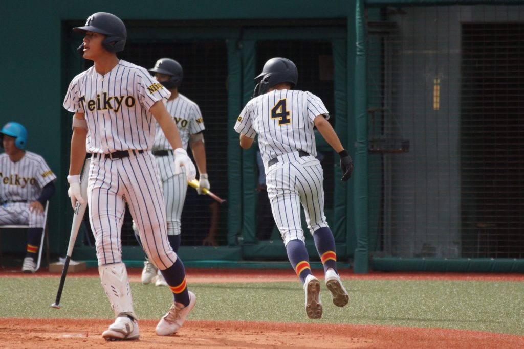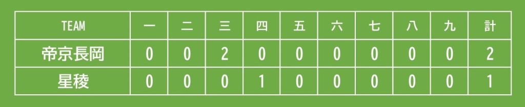 3回表、帝京長岡は2死満塁から、一塁走者が飛び出し、相手捕手が一塁に送球した間に、三塁走者の④兵藤蒼介(1年)が本盗(記録は三重盗)を決めて1点を先制。この後暴投でもう1点を追加