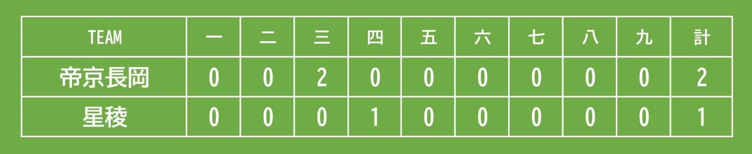 3回表、帝京長岡は2死満塁から、一塁走者が飛び出し、相手捕手が一塁に送球した間に、三塁走者の④兵藤蒼介(1年)が本盗(記録は三重盗)を決めて1点を先制。この後暴投でもう1点を追加