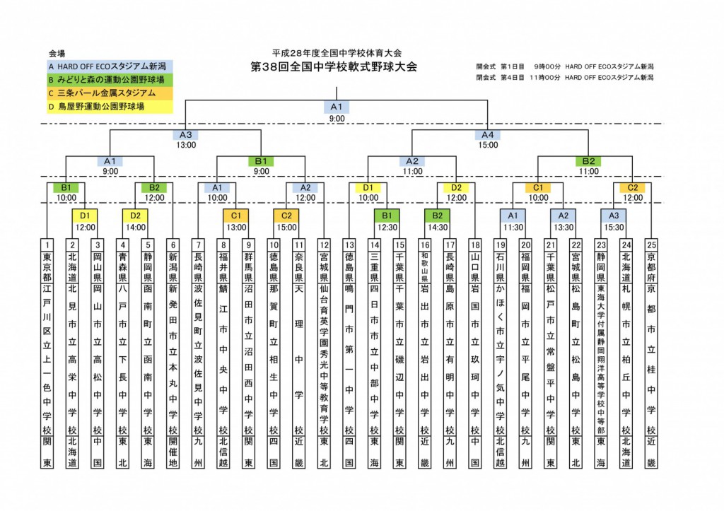 大会は新潟市のハードオフ・エコスタジアムをメイン会場に、鳥屋野球場、みどりと森の運動公園、三条市の三条パール金属スタジアムの4会場でおこなわれる。決勝戦は22日(月)9時からハードオフ・エコスタジアムでおこなわれる予定。