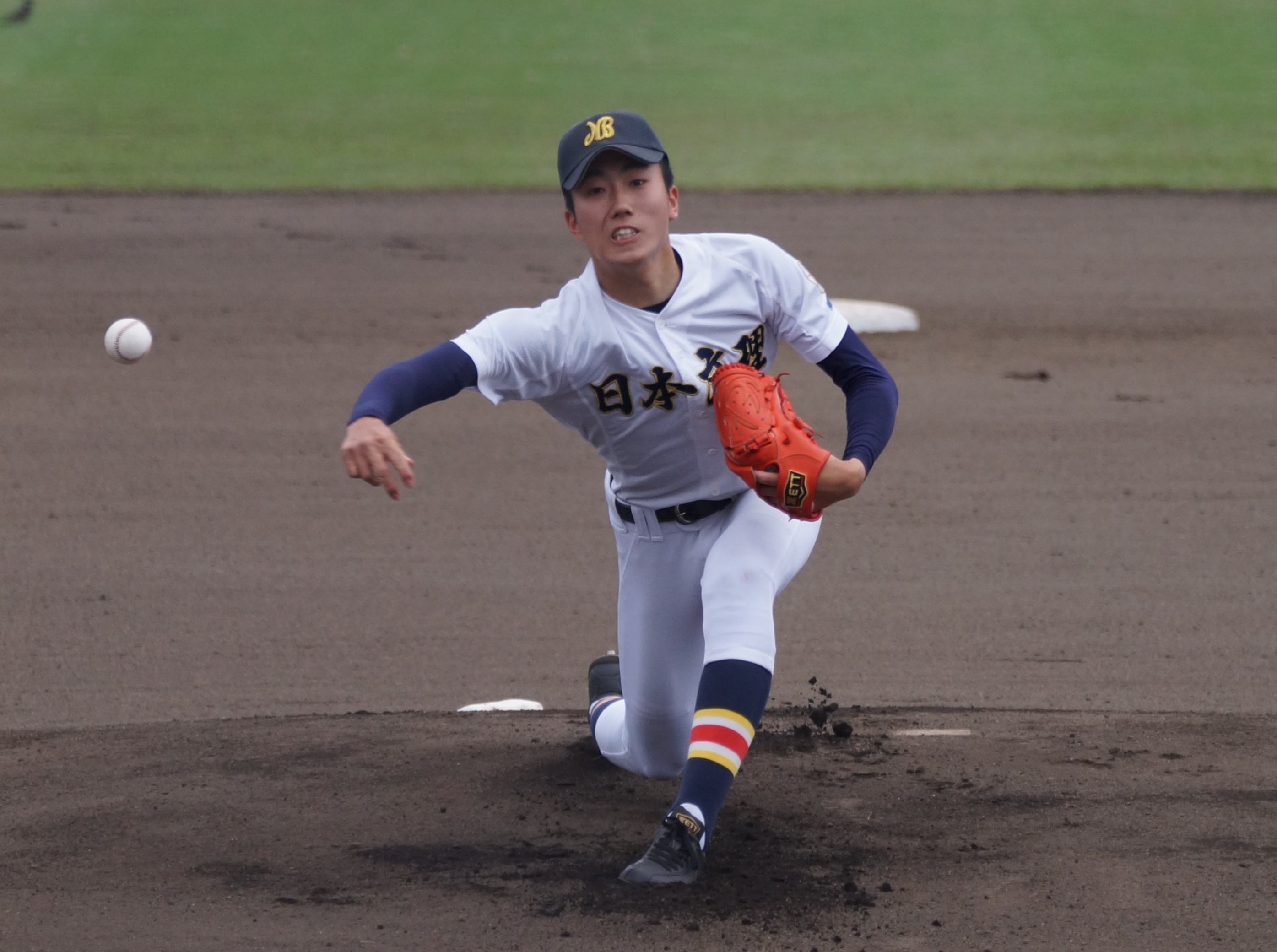 日本文理の①稲垣豪人は2回途中から登板し、被安打10も無失点に抑えた