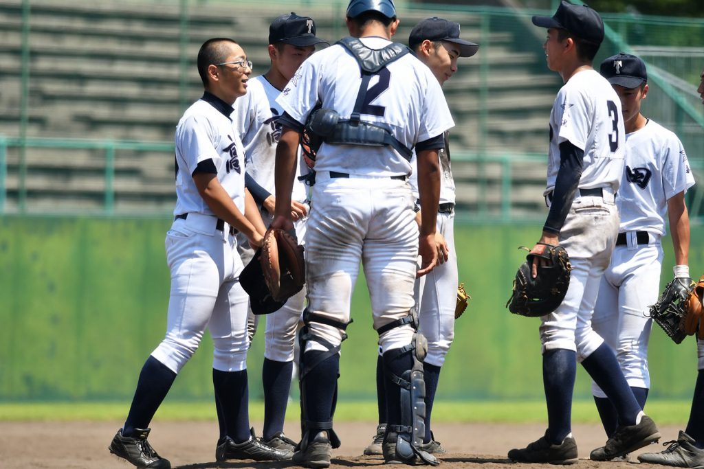 6回裏、高田は川合元太(3年・左端)が伝令としてマウンドへ