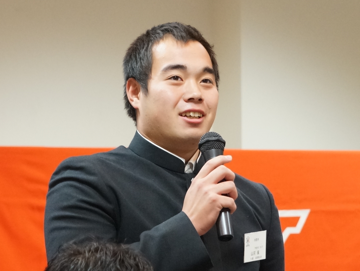 「大学時代の監督に扇の要と言われ、勝敗を左右するのは捕手と言われてきた。体は小さいが自分の名前にあるように昇りつめて大きな存在になれるような捕手になりたい。56番という背番号は歴代すごい存在の人がつけてきた。自分も負けないように頑張りたい。肩の強さとパンチのある打撃が武器。足も注目してほしい。チームの印象は、2人先輩がいてサポーターの皆さんが温かいと聞いている。(アルビOBの青木智史コーチから)大学時代に厳しい言葉、優しい言葉をかけてもらってきた。恩返ししたい気持ちがある。本塁打数などサポーターの印象に残るよう、全部の記録を越えていきたい」