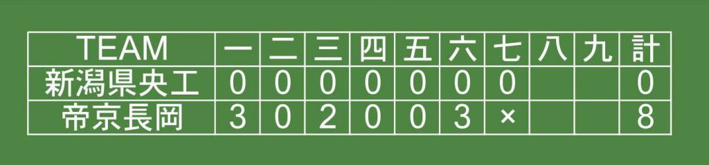 6回裏、帝京長岡が江柏葳(2年)の犠飛で三塁打で出塁の福野晴太(3年)が生還し8-0