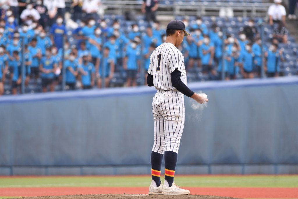 9回表を三者凡退に抑えた日本文理①田中晴也(3年) 右手人差し指のマメがつぶれ赤くにじんでいる