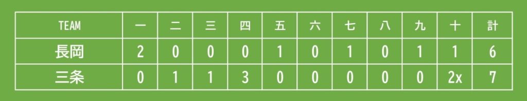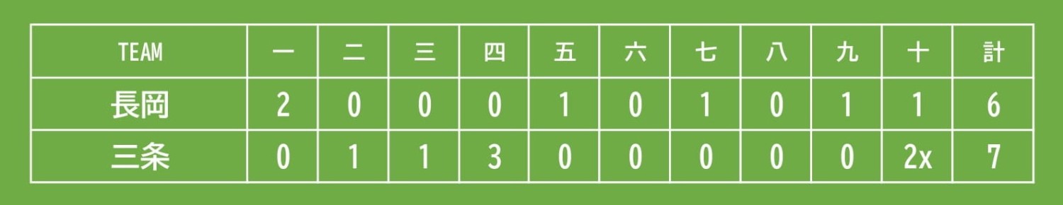 悠久山②三条7-6長岡/4回裏、三条は2死満塁から渡邊隼矢(2年)が走者一掃となる左越え適時二塁打を放ち、5-2と勝ち越す