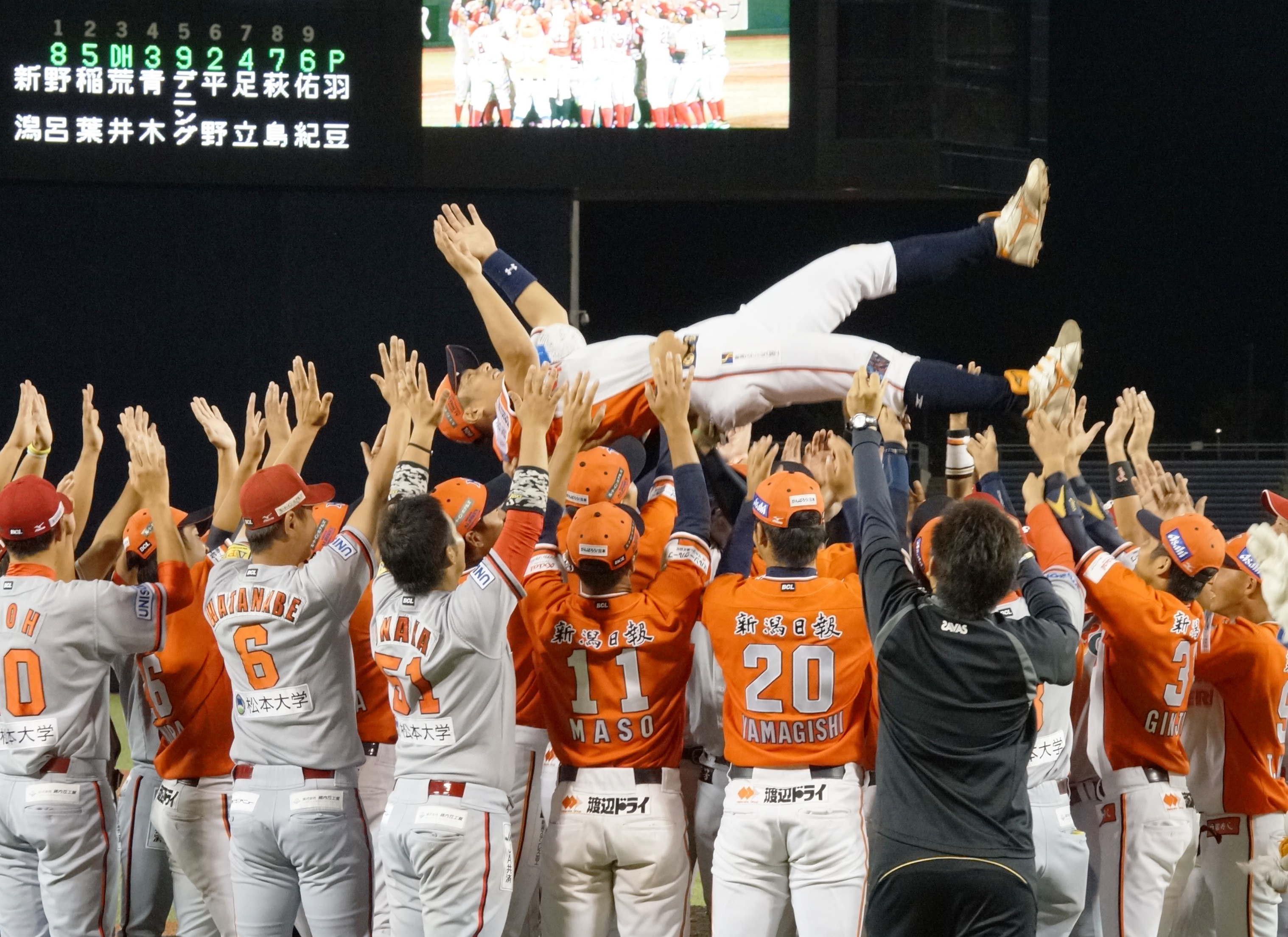 新潟、信濃の両チームの選手に胴上げされる青木選手