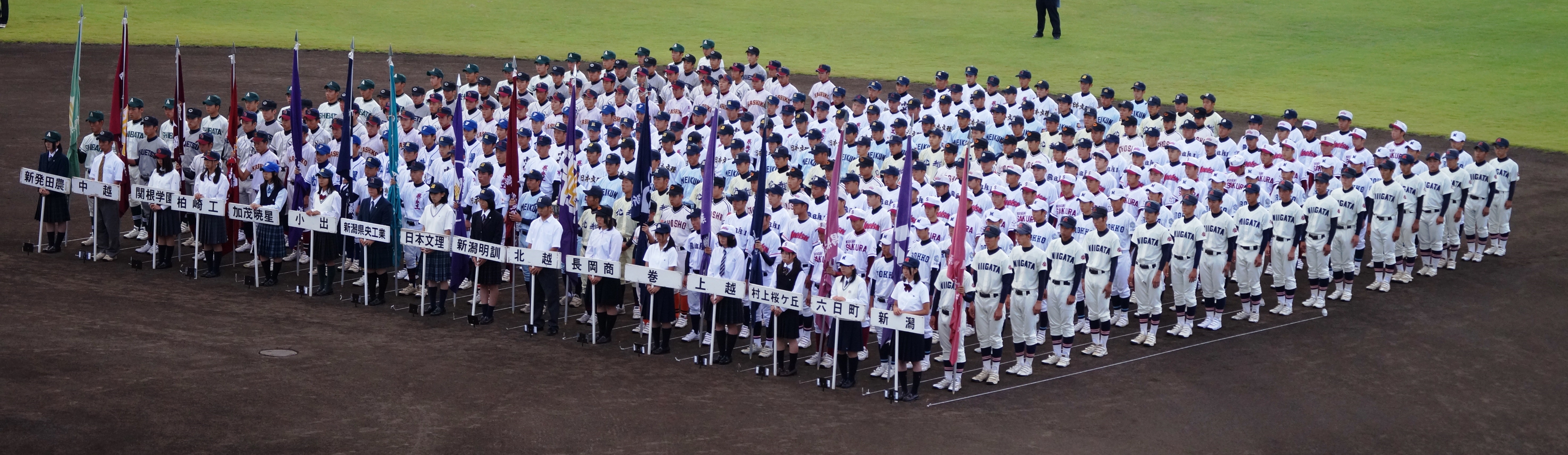 鳥屋野球場では16校が参加した開会式がおこなわれ、選手を代表して六日町高校2年の関矢渓登(けいと)主将が「支えてくれる全ての方への感謝を胸に、高校生らしくさわやかに全力でプレーすることを誓います」と選手宣誓をおこなった。